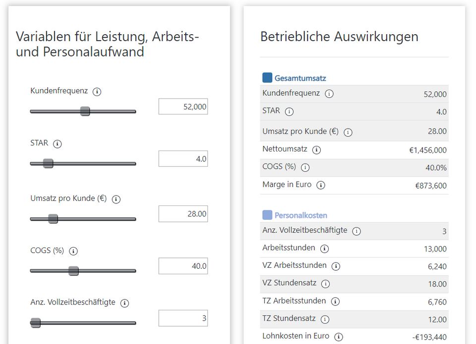 Hier können Sie weitere Kennzahlen eingeben, zum Beispiel das Verhältnis zwischen Kunden und Verkaufspersonal (Shopper-To-Associate Ratio – STAR), den Umsatz pro Kunde (Sales per Shopper – SPS), die Arbeitsstunden und vieles mehr. Sie erhalten ein detaillierteres Ergebnis und verstehen besser, wie sich die einzelnen Kennzahlen auf die Rentabilität Ihres Geschäfts und die Personalkosten auswirken.